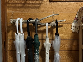 自宅に☂を置く決まったスペースがなく、妻のリクエストで傘掛けを作成して玄関に設置しました。流木ゆえ脆くてちょっと手間取りましたが、接続に麻ひもを使い、なんとなく良い雰囲気が出てそこそこ満足です。新しい家でもなく、また、下がっているのは安い傘ばかりなので十分です。それにしてもビニール傘ばかり😓